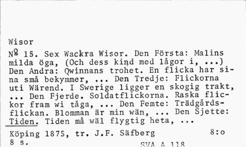//// Wisor //// N^ 15. Sex Wackra Wisor. Den Första: Malins milda öga, (Och dess kind med lågor i, ...) Den Andra: Qwinnans trohet. En flicka har sina små bekymmer, ... Den Tredje: Flickorna uti Wärend. I Swerige ligger en skogig trakt, ... Den Fjerde. Soldatflickorna. Raska flickor fram wi tåga, ... Den Femte: Trädgårdsflickan. Blomman är min wän, ... Den Sjette: Tiden. Tiden må wäl flygtig heta, ... //// Köping 1875, tr. J.F. Säfberg 8:0 //// O Se ////