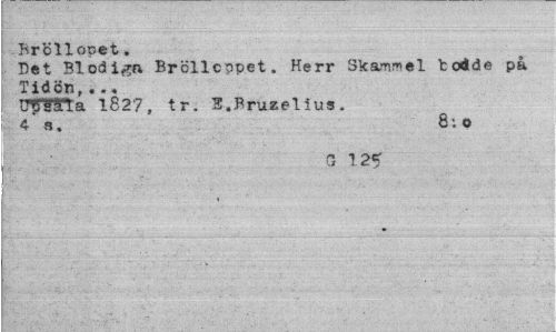 //// Bröllocet. //// Det Blodig Bröllcppet. Herr Skammel todde pa Tidön, //// urarta 1827, tr. E.Bruzelius. //// 4*3. 8;0 //// s 125 ////