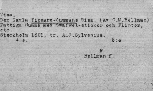 //// •fina, //// ?en Gamla T igp;arc -Gumm ans ?-'isa, ( Av C.F.Bellman) Fattiga Gumma JUm S«r ^a^wet- a t i ek o r och Flintor, et« . //// Stockholm 1801, tr. A.J .Sylveniu». //// 4 5 , 8; o //// ¥ //// Bellraan f ////