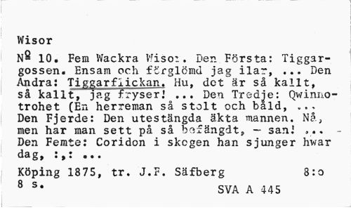 //// Wisor //// N- 10. Fem Wackra Wisor. Der. Första: Tiggargossen. Ensam och förglömd jag ilar, ... Den Andra: Tiggarflickan. Hu, det är så kallt, så kallt, jag fryser.' ... Den Tredje: Qwinno-trohet (En herreman så stolt och bald, Den Fjerde: Den utestängda äkta mannen. Nå, men har man sett på så befängdt, — sanJ ... - //// Den Femte: Coridon i skogen han sjunger hwar Qf • • • //// Köping 1375, tr. J.F. Säfberg 8:0 //// 8 s* SVA A 445 ////