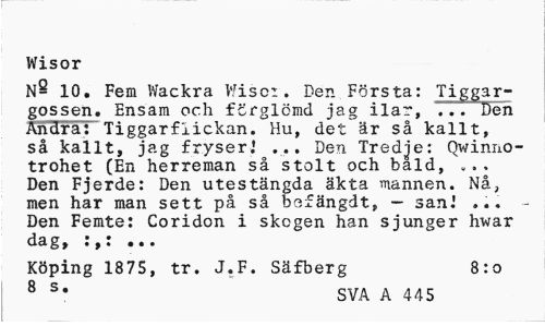 //// Wisor //// N- 10. Fem Wackra Wisc:. Den Första: Tiggargossen. Ensam och förglömd jag ilar, 77. Den Andra: Tiggarflickan. Hu, det är så kallt, så kallt, jag fryser.' ... Den Tredje: Qwinno-trohet (En herreman så stolt och bald, ... Den Fjerde: Den utestängda äkta mannen. Nå, men har man sett på så bofängdt, — sani ... -Den Femte: Coridon i skogen han sjunger hwar dag, :,: ... //// Köping 1875, tr. J.F. Säfberg 8:0 //// 8 s# SVA A 445 ////