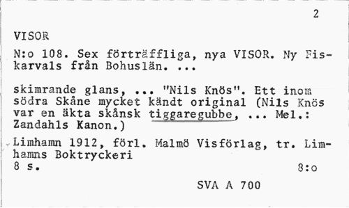 //// 2 //// VISOR //// N:o 108. Sex förträffliga, nya VISOR. Ny Fiskarvals från Bohuslän. ... //// skimrande glans, ... "Nils Knös". Ett inom södra Skåne mycket kändt original (Nils Knös var en äkta skånsk tiggaregubbe, ... Mel.: Zandahls Kanon.) //// .Limhamn 1912, förl. Malmö Vis förlag, tr. Limhamns Boktryckeri //// 8 s. 3:o //// SVA A 700 ////