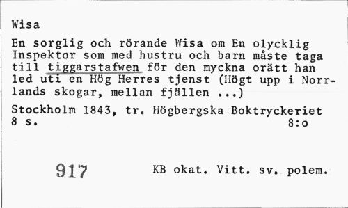 //// Wisor //// En sorglig och rörande Wisa om En olycklig Inspektor som med hustru och barn måste taga till tiggarstafwen för den myckna orätt han led uti en Hög Herres tjenst (Högt upp i Norrlands skogar, mellan fjällen ...) //// Stockholm 1843, tr. Högbergska Boktryckeriet 8 s. 8:0 //// 927 KB okat. Vitt. sv. polem. ////