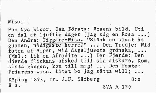 //// Wisor //// Fem Nya Wisor. Den Första: Rosens bild. Uti en dal af ljuflig dager (jag såg en Rosa ...) Den Andra: Tiggare=Wisa. "Skänk en slant åt gubben, nådigaste herre]" ... Den Tredje: Wid foten af Alpen, wid dagsljusets grönska, ... (Mel.: Lik en Afrodite ...) Den Fjerde: Den döende flickans afsked till sin älskare. Kom, sista gången, kom till mig! ... Den Femte: Friarens wisa. Litet bo jag sätta will; ... //// Köping 1875, tr. J.F. Säfberg 8:0 //// 8 s* SVA A 170 ////
