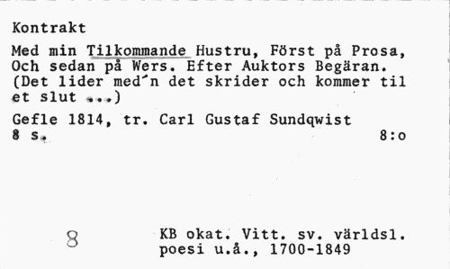 //// Kontrakt //// Med min Tilkommande Hustru, Först på Prosa, Och sedan på Wers. Efter Auktors Begäran. (Det lider med^n det skrider och kommer til et slut «,*) //// Gefle 1814, tr. Carl Gustaf Sundqwist 8 s* 8:0 //// o KB okat. Vitt. sv. världsl. //// 0 poesi u.å., 1700-1849 ////