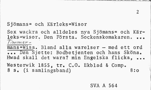 //// 2 //// Sjömans= och Kärieks=Wisor //// Sex wackra och alldeles nya Sjömans= och Kär-leks=wisor. Den Första. Sockenskomakaren» ... //// 7*/ h* e ir ~ //// mans=Wisa. Bland alla warelser - med ett ord ^.. Den ~S jet te: Bodbetjenten och hans Sköna. Hwad skall det wara? min Engelska flicka, ... //// Westerwik 1855, tr. C.O. Ekblad & Comp. 8 s. (i samlingsband) 8:o //// SVA A 564 ////