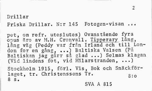 //// 2 //// Drillar //// Friska Drillar. N:r 145 Fotogen-visan .i. //// pet, om refr. uteslutes) Ovanstående fyra opus äro av M.H. Cronvall. Tipperary lång, lång väg (Peddy var från Irland och till London for en gång, ...) Baltiska Valsen (På Baltiskan jag gårr sa glad ...) Selmas klagan (Vid lindens fot, vid Mälarstranden, ...) //// Stockholm 1915, förl. Vis, Bok och Snäckför-laget, tr. Christenssons Tr. o.0 //// S S * //// SVA A 815 ////
