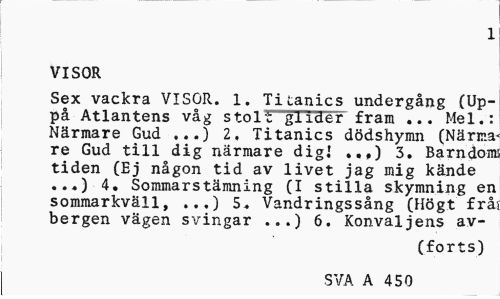 //// 1 //// VISOR //// Sex vackra VISOR. 1. Tilanics undergång (Up-på Atlantens våg stolt glider fram ... Mel.: Närmare Gud ...) 2. Titanics dödshymn (Närma re Gud till dig närmare digj ..,) 3. Barndom tiden (Ej någon tid av livet jag mig kände ...) 4. Sommarstämning (I stilla skymning en sommarkväll, ...) 5, Vandringssång (Högt frå bergen vägen svingar ...) 6. Xonvaljens av- //// (forts) //// SVA A 450 ////