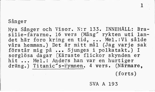 //// 1 //// Sånger //// Nya Sånger och Visor. N:r 133. INNEHÅLL: Bra-silie-fararne. 16 vers (Mång"* rykten uti landet här foro kring en tid, ... Mel.:Vi sålde våra hemman.) Det är mitt mål (Jag varje sak förstår mig på ... Sjunges i polkatakt.) I sorglösa dagar (Käraste flickor skynden er hit ... Mel.: Anders han var en hurtiger dräng.) Titanic"s-Hymnen. 4 vers. (Närmare, //// (forts) SVA A 19 3 ////