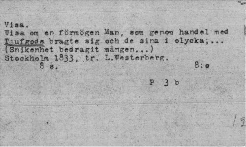 //// Visa. //// Wisa om en förmesen Man, som gencw handel med I.iufgpdn bragte sig och de sina i olycka;... (Snikenhet bedragit mången...) Stockholm 1833, tr. L.Westerberg. 8 s. //// P 3 b ////