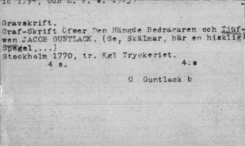 //// Gravskrift. //// Graf-Skrift Cfwer ^en Hängde Bedragaren och ^uf vren JACOB GUNTLACK. (Se, Skälmar, här en hieklii Spfgél,...} //// Stockholm 1770, tr. K*1 Tryckeriet. //// 4 s . 4 ; • //// 0 Guntlack b ////