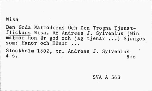//// Wisa //// Den Goda Matmoderns Och Den Trogna Tjenst-flickans Wisa. Af Andreas J. Sylvenius (Min matmor hon är god och jag tjenar .4.) Sjunges som: Hanor och Hönor ... //// Stockholm 1802, tr. Andreas J. Sylvenius 4 s. 8:0 //// SVA A 363 ////