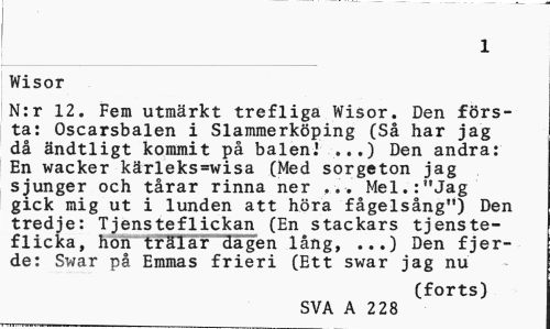 //// 1 //// Wisor //// N:r 12. Fem utmärkt trefliga Wisor. Den första: Oscarsbalen i Slammerköping (Så har jag då ändtligt kommit på balen. ...) Den andra: En wacker kärleks=wisa (Med sorgeton jag sjunger och tårar rinna ner ... Mel.:"Jag gick mig ut i lunden att höra fågelsång") Den tredje: Tjensteflickan (En stackars tjenste-flicka, hön tfSiär dagen lång, ...) Den fjer-de: Swar på Emmas frieri (Ett swar jag nu //// (forts) //// SVA A 2 28 ////