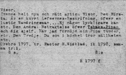 //// VidOr. //// jrenne helt nya och rätt artiga Wisor, "Hen Första; År en korrt Lefwernea-Beskrifning, öfwer en lustig Wand ringsman,,».Ej någon lyckligare kan etf. Den And ra i Betraktelse öfwer T^aVn-P^p och dig sjelf. När jag förnöjd min Pipa tänder, etr. Den Tredje: Du 30m i höghet tror sällheten //// OreVro 1797, 'tr. Pactor S.Widblad, it 1798, sam-na tr;i. //// 8 s. ' . - 8;9 //// É 179*7 t ////