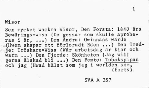 //// 1 //// Wisor //// Sex mycket wackra Wisor, Den Första: 1840 års Bewärings=wisa (De gossar som skulle aprober ras i år, ...) Den Andra: Qwinnans wärde .(Hwem skapar ett förloradt Eden ...) Den Tredje: Tröskare=Wisa (Wår arbetsdag är klar och warm Den Fjerde: Skönheten (Jag wil] //// gerna älskad bli ...) Den Femte: Tobakspipan och jag (Hwad hälst som jag i werlden ser, //// (forts) //// SVA A 2 28 ////