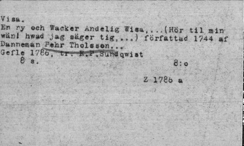 //// Visa. //// Er ry och Wacker Andelig Wisa,...(Hör til nsir wänl hwad jag säger tig,...) författad 1744 af Danrieman P«hr Tholssen... //// Gefle 178o",...ti"?1 qwi st //// 8 3. 8:0 //// Z 1786 a //// . ' j ' • ////