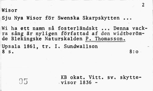 //// 2 //// Wisor //// Sju Nya Wisor för Swenska Skarpskytten ... //// Wi ha ett namn så fosterländskt ... Denna vackra sång är nyligen författad af den widtberöm-de Blekingske Naturskalden P. Thomasson. //// Upsala 1861, tr. I. Sundwallson 8 s. 8:o //// KB okat. Vitt. sv. skytte-;J visor 1836 - ////