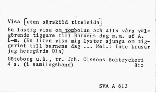 //// Visa [utan särskild titelsida) //// En lustig visa om tombolan och alla våra välgörande tiggare till Barnens dag m.m. af A. L-m. (En liten visa mig lyster sjunga om tiggeriet till barnens dag ... Mel.: Inte krusar jag herrgårds Ola) //// Göteborg u.å., tr. Joh. Olssons Boktryckeri 4 s. (i samlingsband) 8:0 //// SVA A 613 ////
