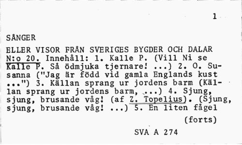 //// 1 //// SÅNGER //// ELLER VISOR FRÄN SVERIGES BYGDER OCH DALAR N:o 20. Innehåll: 1. Kalle P. (Vill Ni se Kalle P. Så ödmjuka tjernare.1 ...) 2. 0. Susanna ("Jag är född vid gamla Englands kust ...") 3. Källan sprang ur jordens barm (Källan sprang ur jordens barm, ..) 4. Sjung, sjung, brusande vågJ (af Z. Topelius). (Sjung, sjung, brusande våg! ...) 5. En liten fågel //// (forts) //// SVA A 2 74 ////
