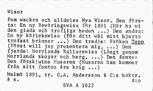 //// Wisor //// Fem ivackra och alldeles Nya Wisor. Den första: En ny Bewäringswisa för 1891 (Här ha wi den glada och trefliga heden ...) Den andra: En ny kärlekswisa (För ditt wäl mitt hjerta trofast brinner ...) Den tredje: Fröken Topp (Först will jag presentera mig, ...) Den fjerde: Norrlands Rallarewisa (Långt genom Norrlands skogar och berg, ...) Den femte: Den förskiutne Husaren (Husaren han kommer från sitt femton års krig ...) //// Malmö 1891, tr. G.A. Andersson & C:s boktr. 8 s. 8: o //// SVA A 1022 ////