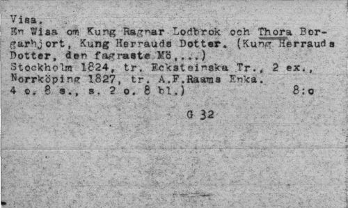 //// Visa. w //// Rn »Jisa OT Kung Ra/rnar Lodhrok och Thor a Borgarhjort, Kung Herrauds Dotter. (Kun^r Herrauds Dotter, den fraste Mö ,...) Stockholm 1824, tr. Eckateineka Tr., 2 ex., Norrköping 1827, tr. A.F.Hasras Enka. 4 o. 8 s., s. 2 0.8 hl.) 8:0 ////