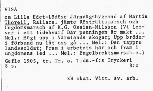//// VISA //// om Lilla Edet-Lödöse Järnvägsbyggnad af Martin Thorell , Rallare, jämte Rösträtts ...narsch och Ungdomsmarsch af K.G. Ossian-Nilsson (Vi lef-ver i ett tidehvarf Där penningen är makt ... Mel.: Högt upp i Värmlands skogar; Upp bröder i förbund nu låt oss gå ... Mel.: Den tappre landssoldat; Fram i arbetets här och fram i ungdomens led ... Mel.: Engelbrektsmarsch^n.) //// Gefle 1905, tr. Tr. o. Tidn.-f:s Tryckeri 8 s. 8:0 //// KB okat. Vitt. sv. arb. ////