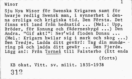 //// Wisor //// Sju Nya Wisor för Swenska Krigaren samt för hwarje redlig Swensk man, i synnerhet i denna oroliga och krigiska tid. Den Första. Det finns ett land från hednatid ... (Mel.: Upp, Bröder, för Konung och fädernesbygd ...) Den Andra. "Gif akti": Ner'wid floden Donau ... (Mel.: Krigarn hwilar sig i mark och skog ..,) Den Tredje. Ladda ditt gevär.': Tag din mun de-. -ring på och ladda ditt gewär ... Den Fjerde. Lägg an!: Från Torneå till Falsterbo (Ett enda //// (forts) //// KB okat. Vitt. sv. milit. 1835-1938 //// 312 ////