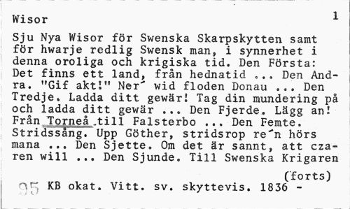 //// Wisor 1 //// Sju Nya Wisor för Swenska Skarpskytten samt för hwarje redlig Swensk man, i synnerhet i denna oroliga och krigiska tid. Den Första: Det finns ett land, från hednatid ... Den Andra. "Gif akti" Ner"* wid floden Donau ... Den Tredje. Ladda ditt gewär! Tag din mundering på och ladda ditt gewär ... Den Fjerde. Lägg an! Från Torneå „till Falsterbo ... Den Femte. Stridssång. Upp Göther, stridsrop re"n hörs mana ... Den Sjette. Om det är sannt, att cza-ren will ... Den Sjunde. Till Swenska Krigaren //// (forts) //// KB okat. Vitt. sv. skyttevis. 1836 - ////