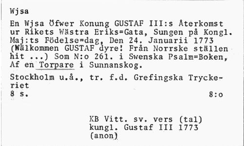 //// Wjsa //// En Wjsa öfwer Konung GUSTAF III:s Återkomst ur Rikets Wästra Eriks=Gata, Sungen på Kongl. Maj:ts Födelse=dag, Den 24. Januarii 1773 (Wälkommen GUSTAF dyre! Från Norrske ställen hit ...) Som N:o 261. i Swenska Psalm=Boken, Af en Torpare i Sunnanskog. //// Stockholm u.å., tr. f.d. Grefingska Tryckeriet //// 8 s. 8:o //// KB Vitt. sv. vers (tal) kungl. Gustaf III 1773 (anon) ////