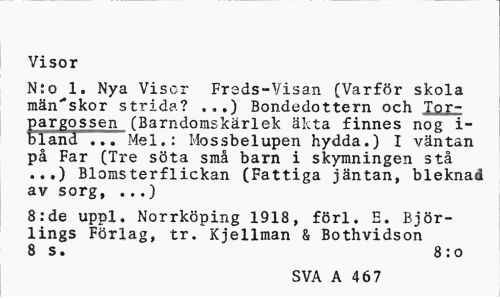 //// Visor //// N:o 1, Nya Visor Freds-Visan (Varför skola män"skor strida? .,.) Bondedottern och Tor-pargossen (Barndomskärlek äkta finnes nog i-bland ... Mel.: Mossbelupen hydda.) I väntan på Far (Tre söta små barn i skymningen stå ...) Blomsterflickan (Fattiga jäntan, bleknad av sorg, ...) //// 8:de uppl. Norrköping 1918, förl. E. Björ-lings Förlag, tr. Kjellman & Bothvidson 8 s. 8:o //// SVA A 467 ////