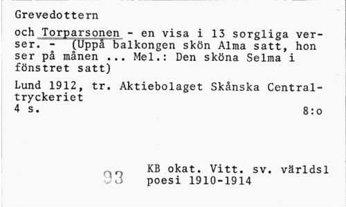 //// Grevedottern //// och Torparsonen - en visa i 13 sorgliga verser. - (Uppå balkongen skön Alma satt, hon ser på månen ... Mel.: Den sköna Selma i fönstret satt) //// Lund 1912, tr. Aktiebolaget Skånska Centraltryckeriet //// 4 s. 8:o //// KB okat. Vitt. sv. världsl 33 poesi 1910-1914 ////