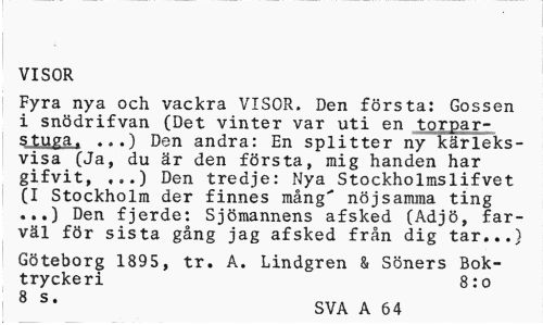 //// VISOR //// Fyra nya och vackra VISOR. Den första: Gossen i snödrifvan (Det vinter var uti en torparstuga. ...) Den andra: En splitter ny kärleksvisa (Ja, du är den första, mig handen har gifvit, ,,.) Den tredje: Nya Stockholmslifvet (I Stockholm der finnes mång" nöjsamma ting ...) Den fjerde: Sjömannens afsked (Adjö, farväl för sista gång jag afsked från dig tar...) //// Göteborg 1895, tr. A. Lindgren & Söners Boktryckeri 8:0 //// 8 S* SVA A 64 ////