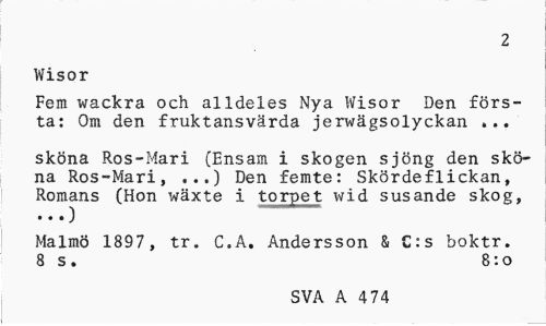 //// 2 //// Wisor //// Fem wackra och alldeles Nya Wisor Den första: Om den fruktansvärda jerwägsolyckan ... //// sköna Ros-Mari (Ensam i skogen sjöng den sköna Ros-Mari, ,..) Den femte: Skördeflickan, Romans (Hon wäxte i torpet wid susande skog, • • •) //// Malmö 1897 , tr. C,A. Andersson & €:s hoktr. 8 s . 8: o //// SVA A 4 74 ////