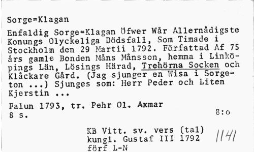 //// Sorge=Klagan //// Enfaldig Sorge=Klagan flfwer Wår Allernådigste Konungs Olyckeliga Dödsfall, Som Timade i Stockholm den 29 Martii 1792. Författad Af 75 års gamle Bonden Måns Månsson, hemma i Linköpings Län, Lösings Härad, Trehörna Socken och Klåckare Gård. (Jag sjunger en Wisa i Sorgeton ...) Sjunges som: Herr Peder och Liten Kjerstin ... //// Falun 1793, tr. Pehr 01„ Axmar //// 8 s. 8: o //// ICB Vitt. sv. vers (tal) ,nn kungl. Gustaf III 179 2 //7/ //// fKvf T _M ////