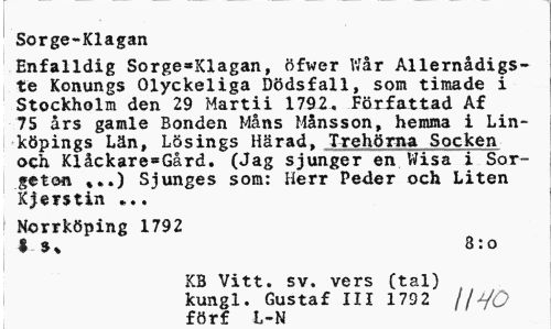 //// Sorge=Klagan //// Enfalldig Sorge*Klagan, öfwer V/år Allernådigs-te Konungs Olyckeliga Dödsfall, som timade i Stockholm den 29 Martii 1792. Författad Af 75 års gamle Bonden Måns Månsson, hemma i Linköpings Län, Lösings Härad, Trehörna Socken och Klåckare*Gård. (Jag sjunger en Wisa i Sorgeton »..) Sjunges som: Herr Pe4er och Liten Kerstin ... //// Norrköping 1792 //// « 3:o //// KB Vitt. sv. vers (tal) kungl. Gustaf III 1792 j^O förf L-N ////