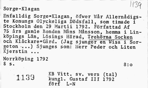 //// i //// Sorge-Klagan //// Enfalldig Sorge*Klagan, öfwer Wår Allernådigs-te Konungs Olyckeliga Dödsfall, som timade i Stockholm den 29 Martii 1792. Författad Af 75 års gamle Bonden Måns Månsson, hemma i Linköpings Län, Lösings Härad, Trehörna Socken och Klåckare=Gård. (Jag sjunger en Wisa i Sorgeton-...) Sjunges som: Herr Peder och Liten Kjerstin ... //// Norrköping 1792 //// 8 s. 8:o //// on KB Vitt. sv. vers (tal) IloJ kungl. Gustaf III 1792 förf L-N ////
