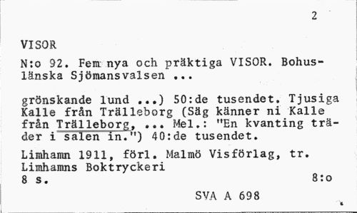 //// 2 //// VISOR //// N:o 92. Fem nya och präktiga VISOR. Bohuslänska Sjömansvalsen ... //// grönskande lund ...) 50:de tusendet. Tjusiga Kalle från Trälleborg (Säg känner ni Kalle från Trälleborg, ... Mel.: "En kvanting träder i salen in.") 40:de tusendet. //// Limhamn 1911, förl. Malmö Visförlag, tr. Limhamns Boktryckeri //// 8 s. 8:o //// SVA A 698 //// * ////