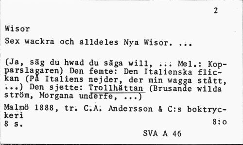 //// 2 //// Wisor //// Sex wackra och alldeles Nya Wisor. ... //// (Ja, säg du hwad du säga will, ... Mel.: Kopparslagaren) Den femte: Den Italienska flickan (Pa Italiens nejder, der min wagga stått, ...) Den sjette: Trollhättan (Brusande wilda ström, Morgana underfe, ...) //// Malmö 1888, tr. C.A. Andersson & C:s boktryc- //// 8es! 8;o //// SVA A 46 ////