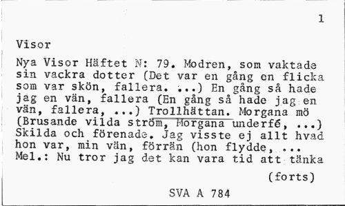 //// 824 //// Visor //// Nya Visor Häftet N: 79. Modren, son vaktade sin vackra dotter (Det var en gång en flicka som var skön, fallera. ...) En gång så hade jag en vän, fallera (En gång så hade jag en vän, fallera, ...) Trollhättan. Morgana mö (Brusande vilda ström, Morgana underfé, ...) Skilda och förenade. Jag visste ej allt hvad hon var, min vän, förrän (hon flydde, ... Mel.: Nu tror jag det kan vara tid att tänka //// (forts) //// SVA A 4 72 ////