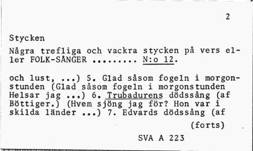 //// 2 //// Stycken //// Några trefliga och vackra stycken på vers eller FOLK-SÄNGER ... N:o 12. //// och lust, ...) 5. Glad såsom fogeln i morgonstunden (Glad såsom fogeln i morgonstunden Helsar jag ...} 6. Trubadurens dödssång (af Böttiger.) (Hvem sjöng jag för? Hon var i skilda länder ...) 7. Edvards dödssång (af //// (forts) //// SVA A 4 72 ////