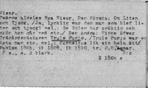 //// fisor. //// Pwänne aldeles Nya Wjsor, Der Fö rata; Cm Liten jch Tjock. /Ja, lycklig war den mar som "blef liten och tjockt "sel.; Se Solen hur Dräktig och skör hon går" ned etc ./ Den Andra*rinne Sftrer fträ gård »mästaren Truls Purio. /Truls Pur jo war er] Igta ffian etc. irel.; Correli us lik sin hela ätt/ ^bldn 1806. it 18C8, ifc iBlO, tr.' P.O.^ar. B s ., 3. 2 blank. n:o //// f. 1806 e ////