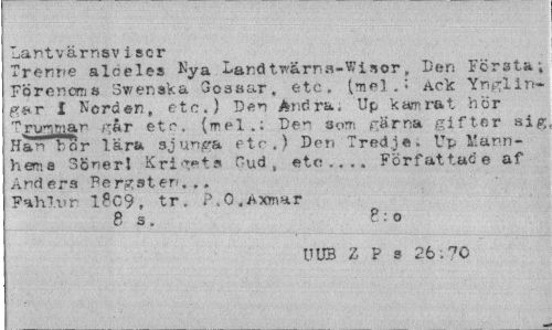 //// Lantvärnav i ser //// Trentte alöelea Nya Landtwärna-Winor,, Den Första -, Föronoro a Svenaka Gossar, etc. (mel.! Ack Ynglingar i Norden, etc.) Den Andra. Up kamrat hor "rxrygan rår etr. (mel Den a om gärna gifter sig Han bor lära sjunga etc.) Den Tredje. Up Mann-hema Sönerl Kriget a Hud, etc,... Författade af Anders Fergaten... Fah7.ur 1?C9» tr, P,C.Axm*r //// 8 a . 6 : o //// UUB Z P s 2 b :"7 O ////