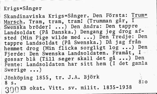 //// Krigs=Sånger //// Skandinaviska Krigs=Sånger. Den Första: Trum= Marsch. Tram, tram, tram] (Trumman går, I Swenska bröderJ ...) Den Ändra: Den tappre Landsoldat (På Danska.) Dengang jeg drog af-sted (Min Pige wilde med ...) Den Tredje: Den tappre Landsoldat (På Swenska.) Då jag från hemmet drog (Min flicka sorgligt log ...) Den Fjerde: Den Swenska Landsoldaten. Framåt, I gossar blå (Till seger skall det gå ...) Den Femte: Landsoldaten har sitt hem (I det gamla Swerige ...) //// i Jönköping 1855, tr. J.A. Björk 8 s. 8:0 //// 2nn KB okat. Vitt. sv. milit. 1835-1938 ////