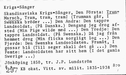//// Krigs=Sånger //// Skandinaviska Krigssånger, Den Första: Trum= Marsch, Tram, tram, tram.' (Trumman går, I Swenska bröder ...) Den Andra: Den tappre Landsoldat. (På Danska.) Dengang jeg drog af-sted (Min Pige wilde med ...) Den Tredje: Den tappre Landsoldat. (På Swenska.) Då jag från hemmet drog (Min flicka sorgligt log ...) Den Fjerde: Den Swenska Landsoldaten. Framåt, I gossar blå (Till seger skall det gå ...) Den Femte: Landsoldaten har sitt hem (I det gamla Swerige ...) //// Jönköping 1850, tr. J.P. Lundström //// KB okat. Vitt. sv. milit. 1835-1938 3:'° ////