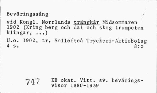 //// Beväringssång <¦ //// vid Kongl. Norrlands trängkår Midsommaren 1902 (Kring berg och dal och skog trumpeten klingar, ...) //// U.o. 1902, tr. Sollefteå Tryckeri-Aktiebolag 4 s. 8: o //// T&7 kb okat. Vitt. sv. bevärings- //// ' ^ ' visor 1880-1939 ////
