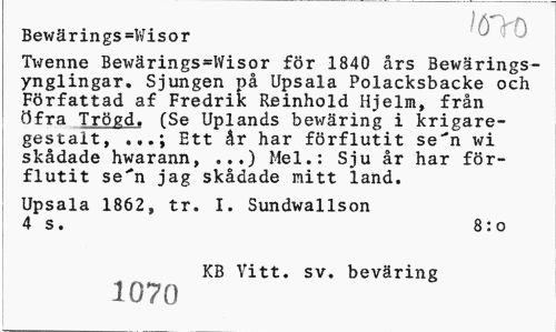 //// Bewärings=Wisor //// Twenne Bewärings=Wisor för 1840 års Bewärings-ynglingar. Sjungen på Upsala Polacksbacke och Författad af Fredrik Reinhold Hjelm, från öfra Trögd. (Se Uplands bewäring i krigare-gestalt, .Ett år har förflutit se"*n wi skådade hwarann, ...) Mel.: Sju år har förflutit se"*n jag skådade mitt land. //// Upsala 1862, tr. I. Sundwallson 4 s. 8: o //// KB Vitt. sv. beväring //// 1070 ////