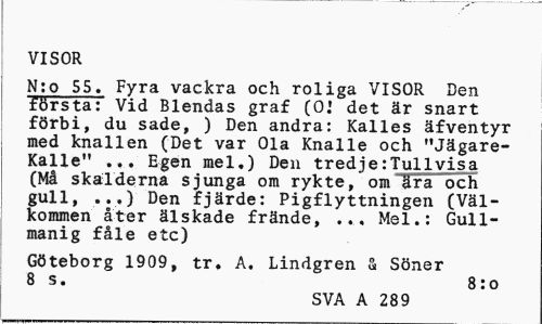 //// VISOR //// N;o 55. Fyra vackra och roliga VISOR Den första: Vid Blendas graf C0*' det är snart förbi, du sade, ) Den andra: Kalles äfventyr med knallen (Det var Ola Knalle och "Jägare-Kalle" ... Egen mel.) Den tredje:Tullvisa (Må skalderna sjunga om rykte, om ära och gul1, ..,) Den fjärde: Pigflyttningen (Välkommen åter älskade frände, ... Mel.: Gull-manig fåle etc) //// Göteborg 1909, tr. A. Lindgren & Söner 8 s. 8:o //// SVA A 289 ////