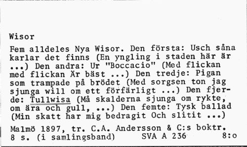 //// Wisor //// Fem alldeles Nya Wisor. Den första: Usch såna karlar det finns (En yngling i staden här är ...) Den andra: Ur "Boccacio" (Med flickan med flickan Är bäst ...) Den tredje: Pigan som trampade på brödet (Med sorgsen ton jag sjunga will om ett förfärligt ...) Den fjer-de: Tullwisa (Må skalderna sjunga om rykte, om ära och gull, ...) Den femte: Tysk ballad (Min skatt har mig bedragit Och slitit ...) //// Malmö 1897, tr. C.A. Andersson & C:s boktr. 8 s. (i samlingsband) SVA A 236 8:o ////