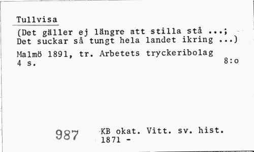 //// Tullvisa //// (Det gäller ej längre att stilla stå ...; Det suckar så tungt hela landet ikring ...) //// Malmö 1891, tr. Arbetets tryckeribolag 4 s. 8:0 //// qo^ KB okat. Vitt. sv. hist. //// 1871 - ////