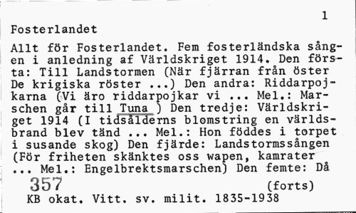 //// 1 //// Fosterlandet //// Allt för Fosterlandet. Fem fosterländska sången i anledning af Världskriget 1914. Den första: Till Landstormen (När fjärran från öster De krigiska röster ...) Den andra: Riddarpoj-karna (Vi äro riddarpojkar vi ... Mel.: Marschen går till Tuna ) Den tredje: Världskriget 1914 (I tidsålderns blomstring en världsbrand blev tänd ... Mel.: Hon föddes i torpet i susande skog) Den fjärde: Landstormssången (För friheten skänktes oss wapen, kamrater ... Mel.: Engelbrektsmarschen) Den femte: Då //// 35? (forts) //// KB okat. Vitt. sv. milit. 1835-1938 ////